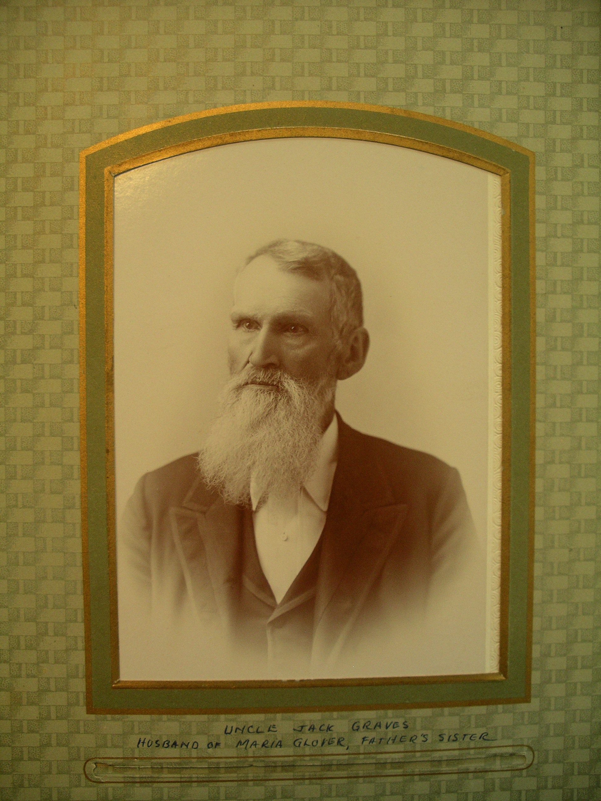John Pinkard Graves was born on 17 May 1824 Pittsylvania County, Virginia. He was the son of William Graves and Lucy Berger. John and Maria Glover, daughter of Philip Glover and Sarah Koontz, were married 21 March 1844 Warren County, Missouri,