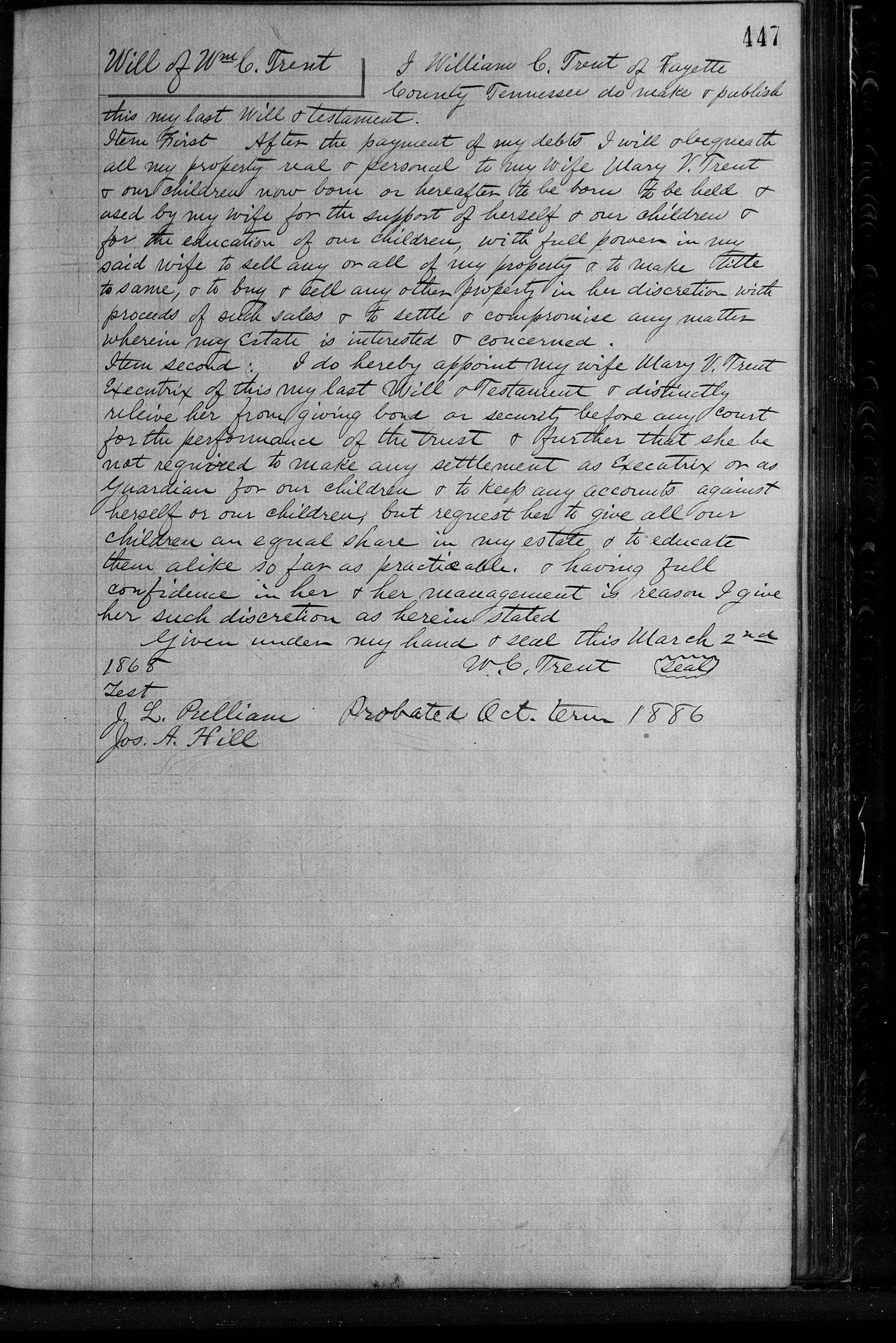 - [S470] Tennessee Probate Court Books, 1795-1927, online https://familysearch.org : accessed 2013., Fayette: Wills 1855-1905, Vol. B, p 447; Will of Wm C. Trent. Hereinafter cited as Tennessee Probate Court Books, 1795-1927.